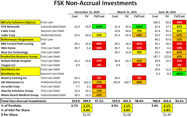 Credit Quality: Non-accrual investments increased from 2.1% to 3.1% of the total portfolio at fair value (5.4% at cost), mostly due to adding some of its watch list investments in 48Forty Solutions, PRG, Worldwise, and Kellermeyer Bergensons, partially offset by removing JW Aluminum, which remains a non-performing asset (coupon was removed). Please note that FSK has among the highest amounts of non-accruals, even before taking into account many additional loans to non-accrual companies that remain on accrual status. Also, Peraton and Medallia remain a concern.