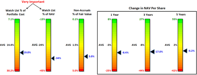 NAV Per Share: Decreased by another 6.2% (from $23.37 to $21.93) due to additional markdowns of its watch list investments (see below) and under-earning the dividends.