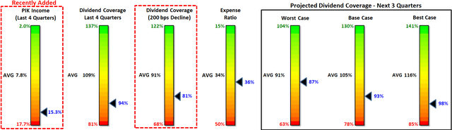 Earnings: Reported below its worst-case projections, mostly related to non-accruals increasing from 3.5% to 5.4% of the portfolio at cost, combined with lower fee income and lower portfolio yield (as expected). Its debt-to-equity ratio continues to increase and is now above its upper targeted ratio of 1.25, with only 85% dividend coverage.